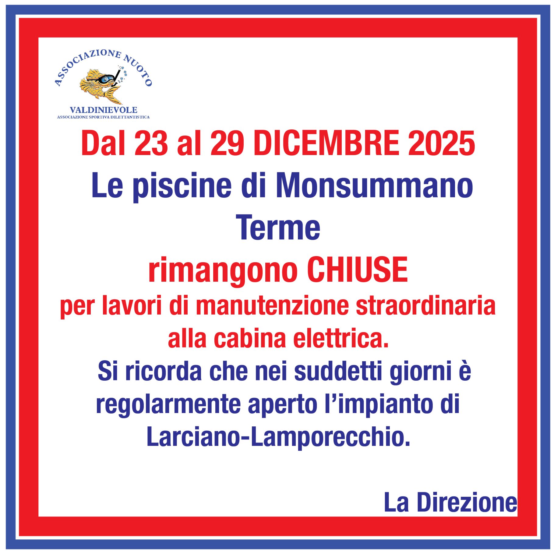 L’Associazione sportiva dilettantistica Nuoto Valdinievole, costituita ed iscritta alla F.I.N. (Federazione Italiana Nuoto) dal 1988, è operante sul territorio della Valdinievole in ambito sportivo per lo sviluppo e l’insegnamento del nuoto, delle attività motorie legate ad esso e della cultura sportiva. L’Associazione gestisce l’impianto sportivo delle Piscine Comunali di Monsummano Terme, di cui è stata direttamente la costruttrice delle piscine esterne e dell’intero parco di 8000 mq che le accoglie e che completerà l’opera con la costruzione di una palestra adiacente all’impianto stesso. Da aprile 2011 gestisce anche l’impianto sportivo delle Piscine Intercomunali di Larciano-Lamporecchio.