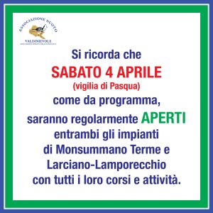 Le vasche interne rimarranno attive in contemporanea con quelle esterne. Tuttavia, l’accesso alla vasca interna potrebbe essere limitato in caso di corsi organizzati, gare o saggi della nostra Scuola Nuoto Federale (SNF FIN).